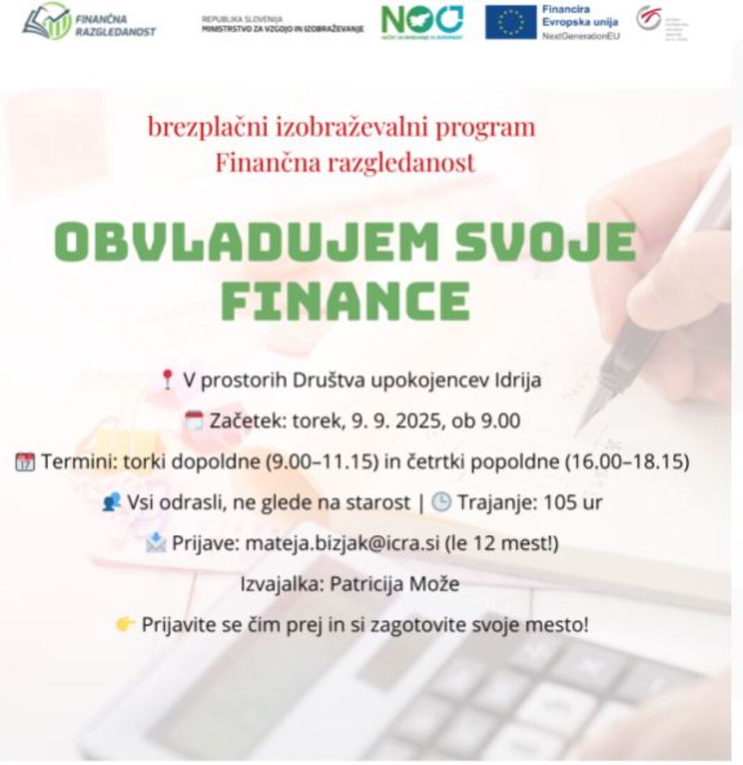 Brezplačni program Obvladujem svoje finance se bo na ICRA začel izvajati septembra 2025 v okviru projekta Finančna razgledanost. Program se bo v Idriji izvedlo samo tokrat, zato ne zamudite priložnosti, da pridobite ključna finančna znanja, ki vam bodo pomagala pri boljšem načrtovanju osebnih financ in doseganju finančne varnosti.