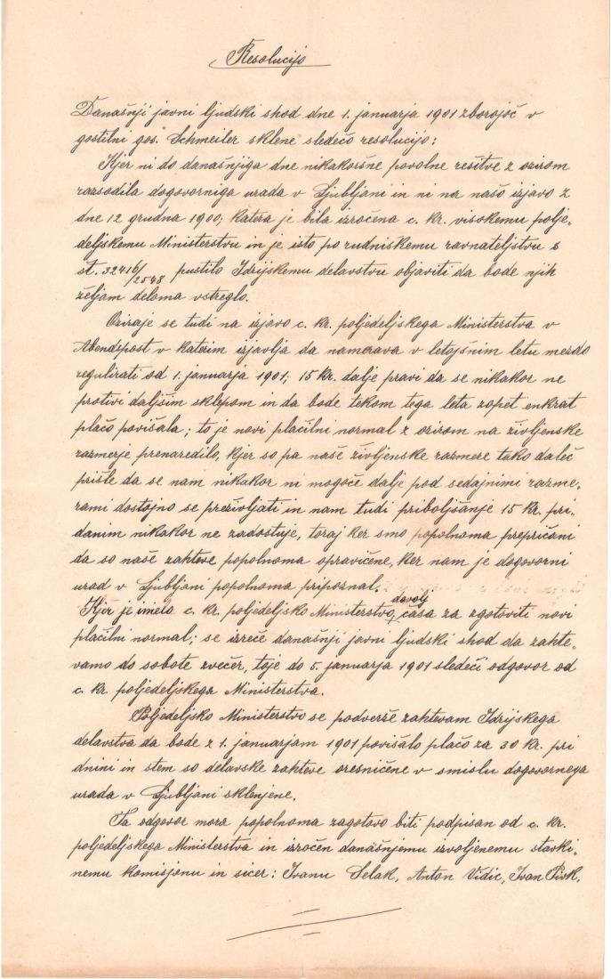 Foto: Prva stran Resolucije idrijskih rudarjev (1901), napisana po dolgem, neuspešnem boju za svoje pravice z rudniško upravo in ministrstvom na Dunaju (vir: enota ZAL v Idriji)