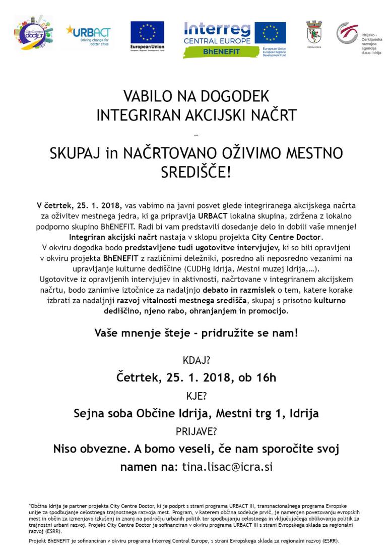 Integriran akcijski načrt nastaja v sklopu projekta City Centre Doctor. V okviru dogodka bodo predstavljene tudi ugotovitve intervjujev, ki so bili opravljeniv okviru projekta BhENEFIT z različnimi deležniki, posredno ali neposredno vezanimi na upravljanje kulturne dediščine (CUDHg Idrija, Mestni muzej Idrija …).