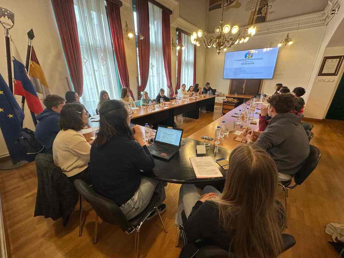 Pravkar v sejni sobi Občine Idrija zaseda medobčinski Otroški parlament, ki ga organizira Zveza prijateljev mladine Idrija. Mladi parlamentarci, delegati osnovnih šol iz občin Idrija in Cerkno, razpravljajo o temi ŠOLSKI SISTEM.
