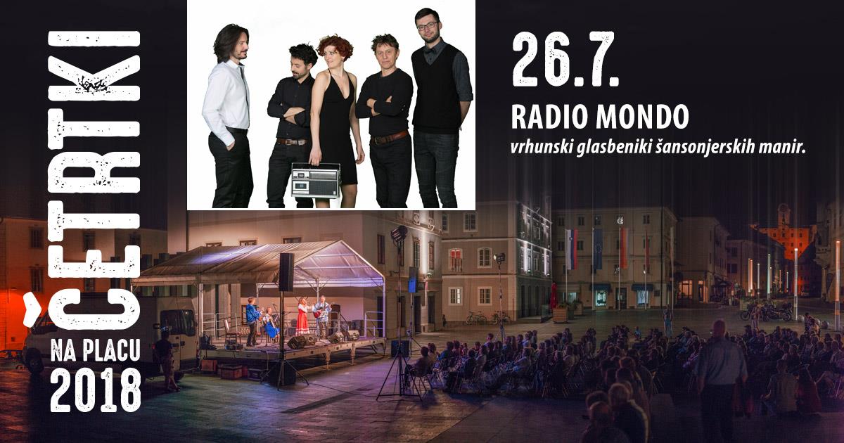Vabljeni na koncert vrhunskih glasbenikov šansonjerskih manir RADIO MONDO v sklopu Četrtkov na placu. V četrtek, 26.7.2018 ob 20:30 na Mestnem trgu v Idriji.