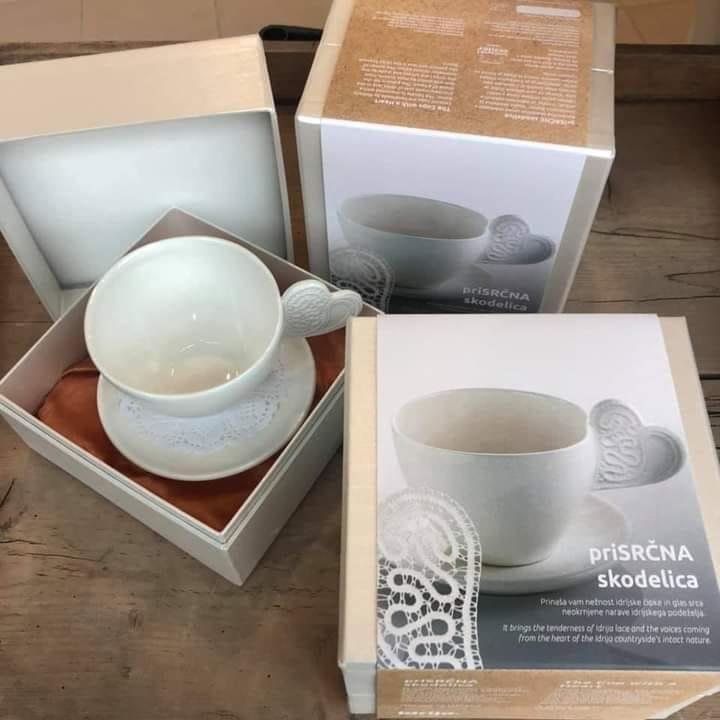 Police TIC Idrija te dni bogati nov turistični izdelek z motivom idrijske čipke. Na Zavodu za turizem Idrija so namreč v sodelovanju z Lončarskim centrom Bahor izdelali spominek, skodelico z odtisom idrijske čipke. Skodelice so ročno delo, zato je vsaka posebna in unikatna. Snovalci so skodelici nadeli ime priSRČNA, saj je ročaj skodelice izdelan v obliki srčka z vtisnjenim srčkastim motivom idrijske čipke, ki je že prepoznaven simbol Zavoda za turizem Idrija. Skodelica je tako dobila ime, embalažo in zgodbo ter s tem postala reprezentativno darilo z Idrijskega. PriSRČNA skodelica je, pakirana v paru, lahko tudi namig za poročno darilo.
