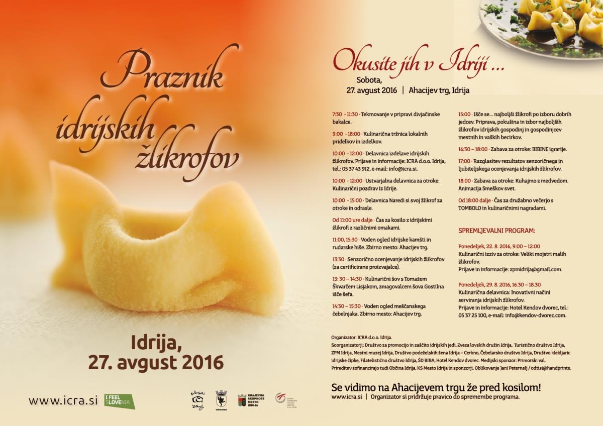 Zadnjo avgustovsko soboto, 27. 8. 2016, bo Idrija ponovno zaživela s Praznikom idrijskih žlikrofov. Ahacijev trg bo že v jutranjih urah popestrila kulinarična tržnica lokalnih pridelkov in izdelkov iz okoliških kmetij. Poleg kosila z idrijskimi žlikrofi obiskovalce čakajo doživetja v obliki delavnic, prikazov in degustacij. Poskusiti bo možno idrijske žlikrofe različnih proizvajalcev in z različnimi omakami, jih izdelati in kupiti ali pa na tržnici kupiti sestavine za pripravo žlikrofov in omak. Že v zgodnjih dopoldanskih urah se bo v kotlih pod spretnimi kuhalnicami lovcev pripravljala divjačinska bakalca. Da jed, ki je nekdaj dajala moč idrijskim knapom in brez katere ni minilo nobeno praznično slavje, znajo v Idriji še danes odlično pripraviti, bodo popoldne pokazali spretne idrijske gospodinje in gospodinjci. S pomočjo ljubiteljev in strokovne komisije za senzorično ocenjevanje bomo izbrali najboljše idrijske žlikrofe v letu 2016.