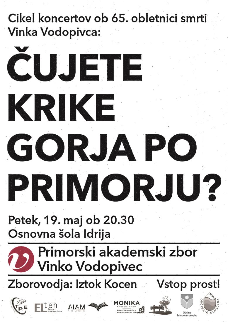 19. maja 2017 se bo ob 20.30 v jedilnici Osnovne šole Idrija odvijal koncert Pevskega akademskega zbora Vinko Vodopivec.