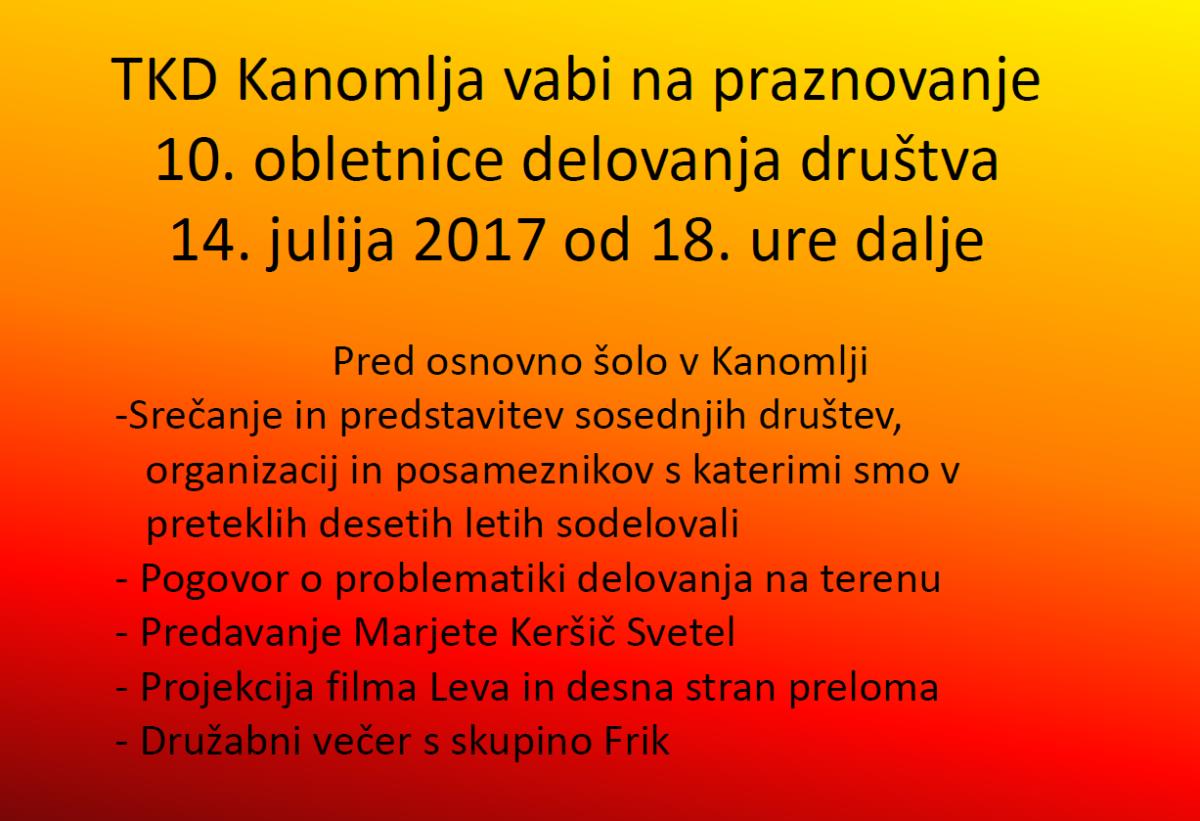 TKD Kanomlja vabi na praznovanje 10. obletnice delovanja društva, ki bo 14. julija 2017, od 18. ure dalje pred osnovno šolo v Kanomlji.